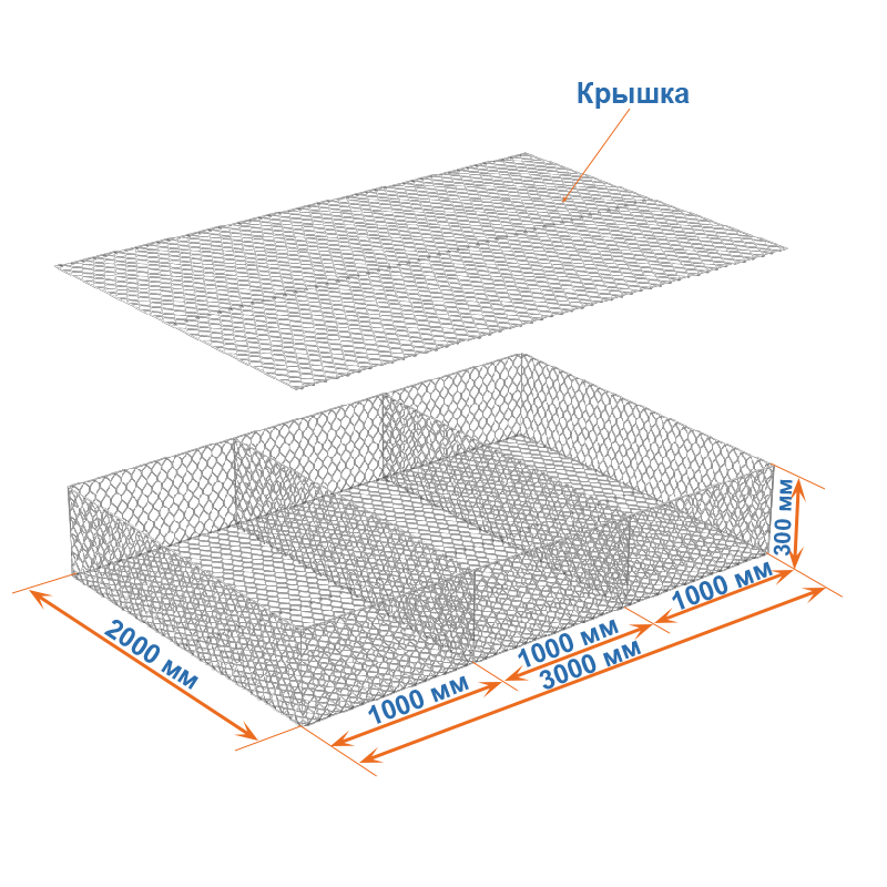 Матрасы Рено 3x2x0,3 — плоские габионные секции из сетки двойного кручения с ячейкой 60х80, проволокой 2,2 мм и покрытием Цинк.